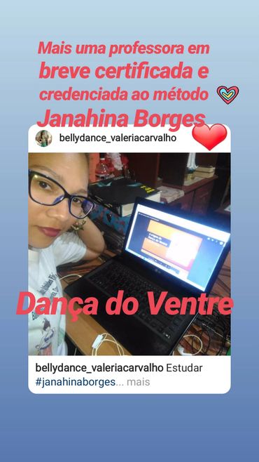"Falar sobre a experiência que tive em fazer parte das alunas da mestra Janahina Borges me enche de alegria. Eu me vi dançando desde a primeira aula porque ela estava ali desde o princípio nos incentivando. Mesmo fazendo parte da turma online eu sentia seu carisma e alegria como se ela estivesse aqui, na sala de minha casa... Eu pude aprender passos que eu via e era ensinado com bastante dificuldade, e ela desvendou todo mistério com seu método simples e didático, deixando seu ensino ainda mais prazeroso sem perder a qualidade. Estudar com ela é simplesmente maravilhoso, levarei seus ensinamentos para toda vida!"